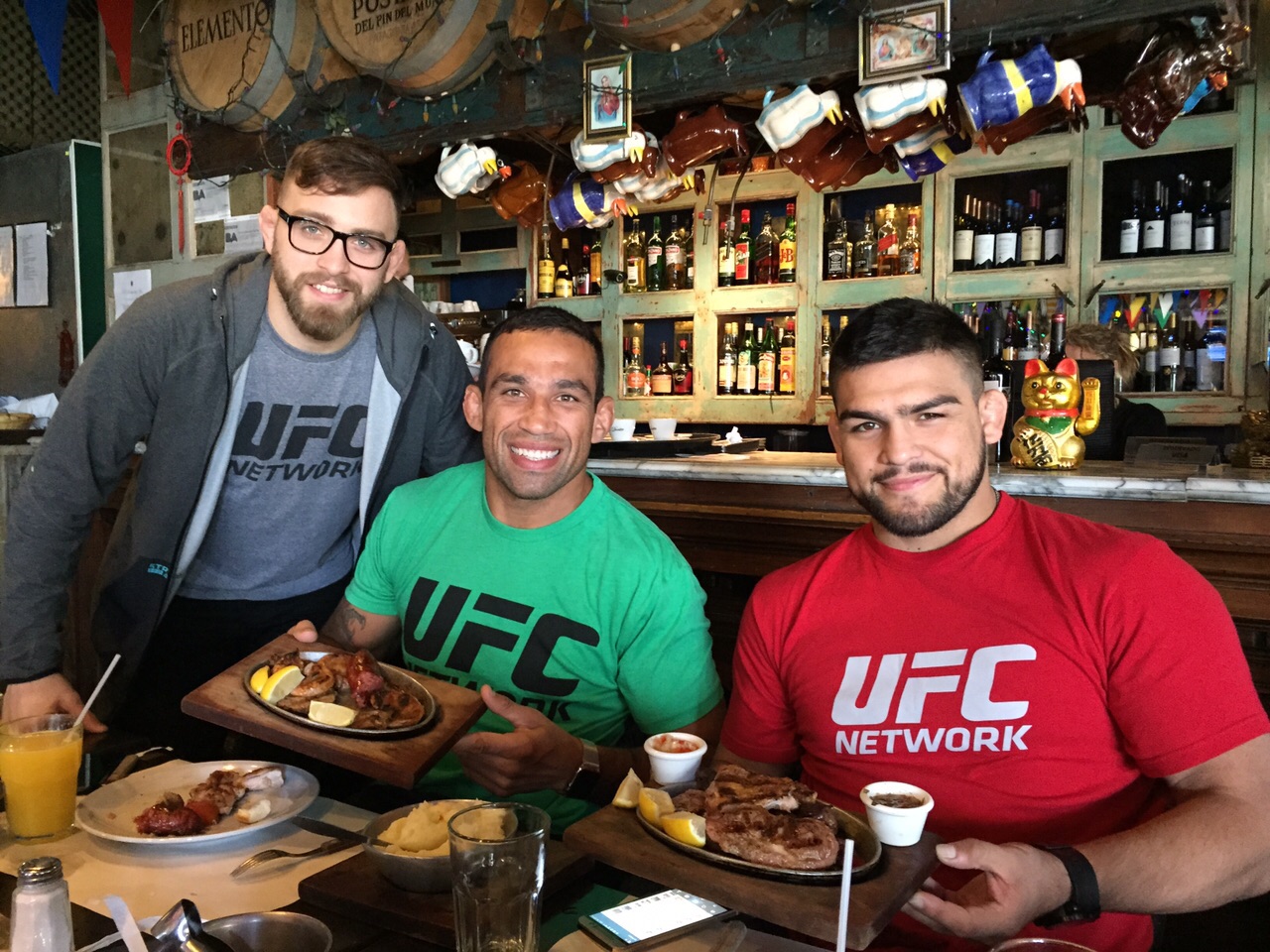 Apenas aterrizaron, y ya con la compañía Kevin Medinilla, argentino y próximo participante del TUF Latinoamérica 2, se dirigieron a una parrilla para degustar el típico asado argentino. Tanto Fabricio como Kelvin quedaron encantados con la carne del país. En especial el brasileño, quien en reiteradas oportunidades ya había manifestado sus ganas de poder conocer Argentina.